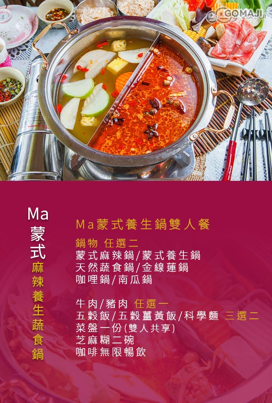 雙人養生鍋物饗宴!【Ma蒙式麻辣養生蔬食鴛鴦鍋】麻而不燥的蒙式麻辣鍋,紅艷迷人的湯底散發無比的辛香,特有的辣勁搭配鍋物一同吃下肚,保證大呼過癮!